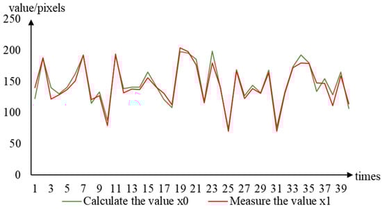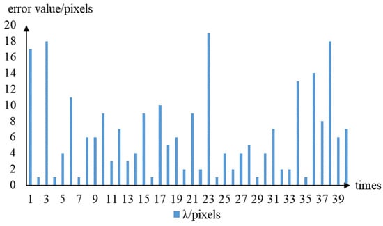 Assuming that the position 10 pixels directly above the lower extreme point was used as the picking point, the positioning error of the picking point was mainly derived from the pixel positioning error of the lower extreme point. First, the position of the extreme point under the grape cluster axis was manually measured, the algorithm proposed here was then used for calculation and comparison, and the error was estimated. The position of the lower extreme point measured manually was marked as (x1, 0), and the calculated position was marked as (x0, 0) (Figure 15). Thus, the pixel error value of the lower extreme point was calculated according to Equation (6), λ = |x1 – x0|. The pixel error of the lower extreme points of the 40 sample images is shown in Figure 16.