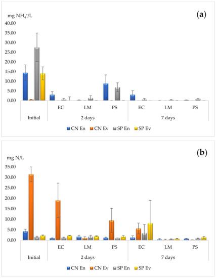 Phytoremediation capacities for two nitrogen species (a) AN, and (b) nitrate, for the three species. EC—E. crassipes, LM—L. minor, PS—P. stratiotes. Results are expressed as mean and standard deviation (n = 3).