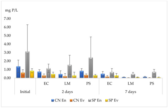 Phytoremediation capacities for phosphorous. EC—E. crassipes, LM—L. minor, PS—P. stratiotes. Results are expressed as mean and standard deviation (n = 3).