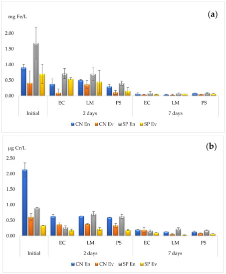 Phytoremediation capacities for (a) iron—Fe, and (b) chromium—Cr. EC—E. crassipes, LM—L. minor, PS—P. stratiotes. Results are expressed as mean and standard deviation (n = 3).