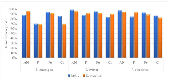 Average phytoremediation yields for four representative analytes, AN, P, Fe, and Cr, after 7 days of contact. The results were considered for the entry and evacuation wastewater.