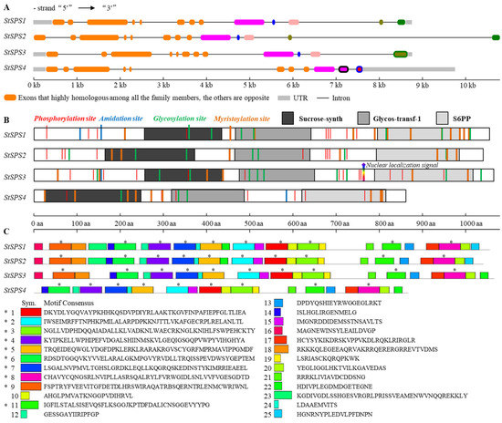 Analysis of the gene and protein structures of StSPS family proteins. (A) Gene structure of the StSPS family genes. (B) Typical domains and functional sites of StSPS family proteins. (C) Prediction of conserved motifs of StSPS family proteins. ‘*’ represents a conservative motif that has been annotated in the database.