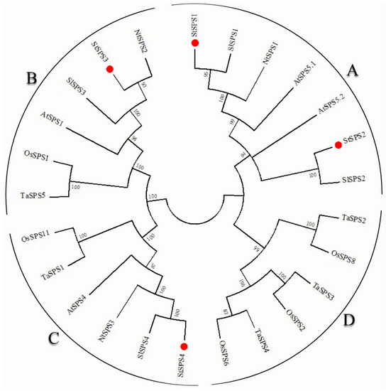 Phylogenetic analysis of SPS family members in Solanum tuberosum, Arabidopsis thaliana, Solanum lycopersicum, Nicotiana tabacum, Oryza sativa, and Triticum aestivum. A/B/C/D represents the four subfamilies. Specific sequence information is shown in File S2.