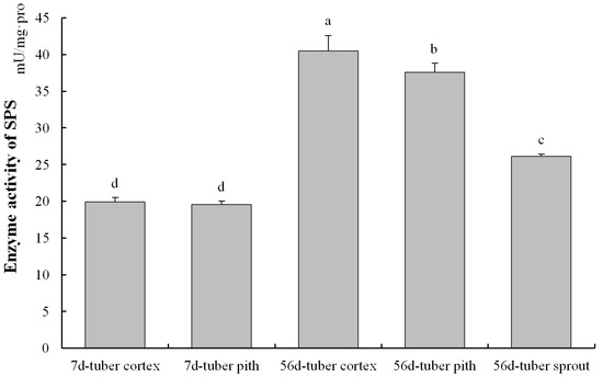 To elucidate the SPS activity levels during the dormancy and sprouting phases of potato tubers, the enzyme activities of the tuber cortex, pith, and sprout were detected subsequent to their storage over a duration of 7 and 56 days. The results showed that the levels of SPS activity in tuber tissues during sprouting were significantly higher than those during dormancy, and there was no significant difference in SPS activity between the tuber pith and tuber cortex during tuber dormancy. In addition, the SPS activity in the tuber sprouts was the lowest when the tubers sprouted, which was significantly lower than the activity levels in the tuber cortex and tuber pith. Although the enzyme activity difference between the tuber cortex and tuber pith reached a significant level, the average difference value was not high (Figure 3). It is indicative that SPS enzyme activity intensifies during the process of tuber sprouting, with a marked accumulation phenomenon observed in the cortex.