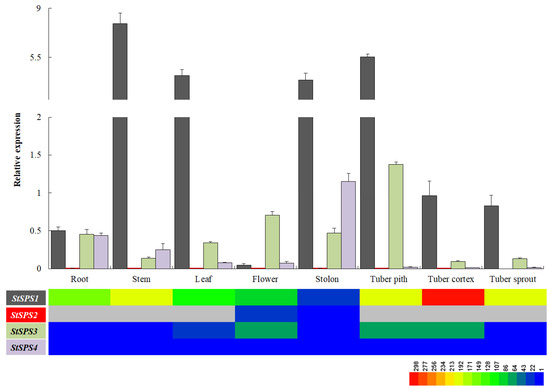 To further verify whether StSPS1 functions as the principal regulator of seed potato vigor, the expression changes from tuber dormancy to sprouting were evaluated. The results showed that the expression of StSPS1 was significantly higher than those of other family genes at all stages, the expression of StSPS3 was less than 0.18 from dormancy to sprouting, the expression of StSPS2/4 was less than 0.04, and the expression of StSPS2 was not even detected in the first three stages. In addition, the expression of StSPS1 gradually decreased in early storage and gradually increased in late storage. Among them, the expression of StSPS1 changed the most. When tuber dormancy was broken at 56 days of storage, the expression of StSPS1 was more than three times that at 7 days (Figure 4). At the same time, the tissue expression level was explored (Figure 5). On the basis of the TPM (transcripts per million) values (File S3) of four StSPS genes in the Ensembl Plants database, it was found that the expression of StSPS1 was the highest in stem and tuber tissues and the lowest in the stolon. Compared with other tissues, StSPS3 is highly expressed in flowers, tuber pith, and tuber cortex. The expression levels of StSPS2/4 in various tissues were very low or below the minimum threshold. Through qRT-PCR detection, it was found that the expression of StSPS1 was the highest in stem and tuber pith (outer pith), slightly lower in leaf and stolon, and the lowest in other tissues. In addition, except for StSPS2, which was not detected in tuber sprouts, four StSPS were expressed in all tissues, although the expression of StSPS2 in all tissues was very low.
