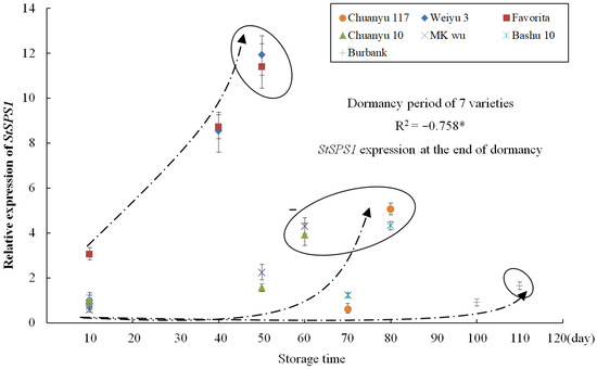 Correlation analysis between StSPS1 expression and tuber dormancy period of different varieties. Names of 7 potato varieties were listed in the rectangle ‘R2’ represents a correlation coefficient. ‘*’ represents a significant difference level at p < 0.05, and the circle marks the end of dormancy. The dotted arrows from top to bottom indicate the expression trend line of StSPS1.