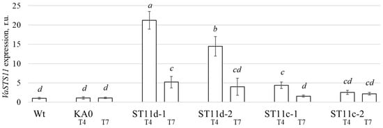 Quantification of the VaSTS11d and VaSTS11c transgene expression levels in transgenic Arabidopsis thaliana of T4 and T7 generation performed by quantitative RT-PCR. Wt—wild-type A. thaliana plants; KA0—the control KA0 A. thaliana plants transformed with the vector harboring only the nptII selective marker; ST11d-1, ST11d-2—two transgenic lines of A. thaliana plants transformed with the intron-containing VaSTS11d; ST11c-1, 2—A. thaliana plants transformed with the intronless VaSTS11c; r.u.—related units; T4 and T7—VaSTS11d- and VaSTS11c-transgenic A. thaliana in the fourth (T4) and seventh (T7) generations. The data are presented as mean ± SE (two independent experiments with eight technical replicates). Means followed by the same letter were not different using Student’s t test, where p < 0.05 was considered to be statistically significant.