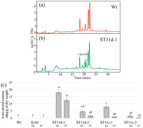 HPLC detection (a,b) and quantification (c) of the trans-piceid content in the VaSTS11d and VaSTS11c transgenic Arabidopsis thaliana. Wt—wild-type A. thaliana plants; KA0—the control KA0 A. thaliana plants transformed with the vector harboring only the nptII selective marker; ST11d-1, ST11d-2—two A. thaliana plant lines transformed with the VaSTS11d gene; ST11c-1, ST11c-2—two A. thaliana plant lines transformed with the VaSTS11c gene; T4 and T7—VaSTS11d and VaSTS11c expression in transgenic A. thaliana of the T4 and T7 generations. The data are presented as mean ± SE (two independent experiments with eight technical replicates). Means followed by the same letter were not different using Student’s t test, where p < 0.05 was considered to be statistically significant.
