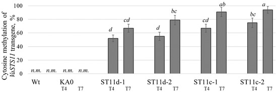 Cytosine methylation level (%) within the selected part of the protein coding regions of the VaSTS11d and VaSTS11c genes. Wt—wild-type A. thaliana plants; KA0—the control KA0 A. thaliana plants transformed with the vector harboring only the nptII selective marker; ST11d-1, ST11d-2—A. thaliana plants transformed with the VaSTS11d gene; ST11c-1, ST11c-2—A. thaliana plants transformed with the VaSTS11c gene; T4 and T7—VaSTS11d and VaSTS11c expression in transgenic A. thaliana of the T4 and T7 generations; n.m.—not measured. The data are presented as mean ± SE (two independent experiments with eight technical replicates). Means followed by the same letter were not different using Student’s t test, where p < 0.05 was considered to be statistically significant.