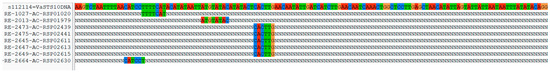 Using bisulfite sequencing, we analyzed the cytosine DNA methylation level of the 394 bp fragment of the 3′ end of the STS coding region in the VaSTS11d and VaSTS11c transgenes. The total level of cytosine DNA methylation in the VaSTS11c transgene of the T4 plant generation was 1.2–1.4 times higher than the total level of cytosine VaSTS11d methylation in the T4 generation (Figure 3). In all transgenic lines, the transgene cytosine methylation increased in plants of the T7 generation in comparison with the T4 plants. Moreover, it reached very high values—up to 91.1–94.2% in the intronless ST11c-1 and ST11c-2 lines (Figure 3). The data indicate that the VaSTS11c transgene in these plants in the T4 and T7 generations is high and can be indicated as hypermethylated [25].