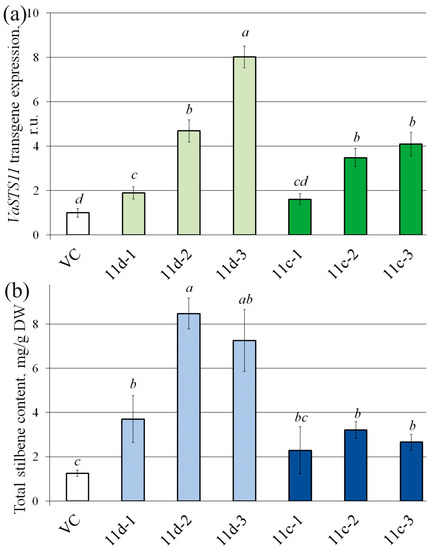 Quantification the VaSTS11 transgene mRNAs performed by quantitative RT-PCR (a) and quantification of total stilbene content performed by HPLC (b) in the transgenic cell cultures of Vitis amurensis. VC—the control V. amurensis cell line transformed with the vector harboring only the nptII selective marker; 11d-1, 11d-2, and 11d-3—V. amurensis cell lines independently transformed with VaSTS11d; 11c-1, 11c-2, and 11c-3—V. amurensis cell lines independently transformed with VaSTS11c; r.u.—related units calculated as described in [32]; fluorescence in VC is indicated as “1”. The data are presented as mean ± SE (two independent experiments with eight technical replicates for quantitative RT-PCR and three independent experiments with two technical replicates). Means followed by the same letter were not different using Student’s t test, where p < 0.05 was considered to be statistically significant.