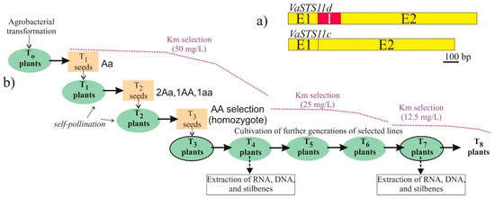 (a) Schematic representation of the VaSTS11d and VaSTS11c transgene; E1—first exon; I—intron; E2—second exon. (b) Schematic representation of the selection procedure for transgenic Arabidopsis thaliana; T0—transformed A. thaliana plants; T1–T8—different generations of A. thaliana transgenic plants; Km—kanamycin.