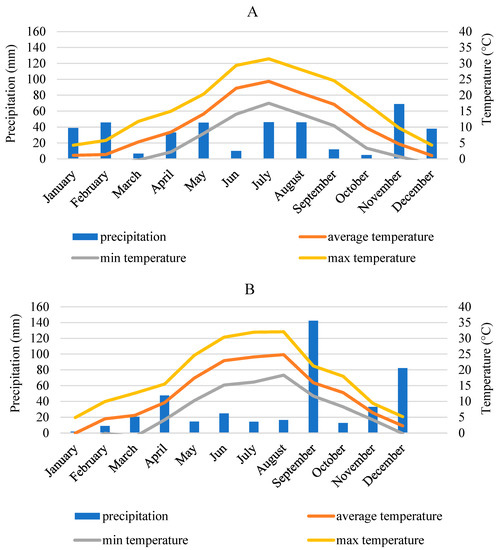 Meteorology data show the minimum, maximum and average temperature, besides the summarized monthly precipitation amount (columns) in 2021 (A) and 2022 (B) (Hungarian Meteorological Service).