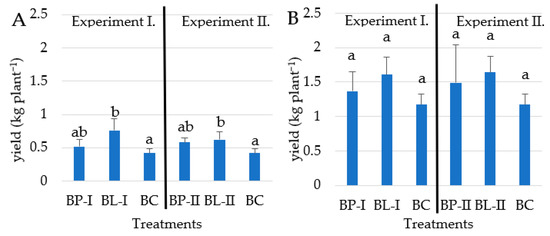 In Experiment I, as a result of the BL-I treatment, the average total carotenoid yield per plant was 151 mg g−1, which was significantly (p > 0.001) higher than the value of 62 mg measured in the control BC treatment, which was represented with the lowest value in the growing season of 2021. The highest carotenoid yield per plant was achieved due to the split K2O predominant dosage for BL-I (256.2 mg g−1) similarly in the growing season of 2022 (Figure 4).