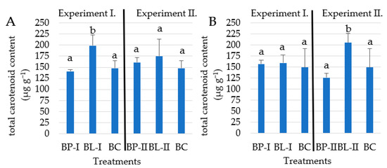 In Experiment I, in the 2021 growing season the maximum total carotenoid value was reached in the BL-I split-dosage treatment with an average 198.8 µg g−1 treatment, which is significantly (p > 0.05) higher than the value obtained by BP-I and BC, which reached 140.7 and 147.7 µg g−1 concentration, respectively. In 2022 the highest total carotene concentration was also achieved under BL-I treatment with an average of 159.1 µg g−1, but the difference between treatments was not significant. Experiment II showed similar results to Experiment I, where the split-dosage fertilizer treatment BL-II achieved the highest total carotene concentration in both growing seasons. BL-II treatment of total carotene concentration was 175.1 µg g−1 in 2021 which is higher than BP-I, but the difference was not significant. In the 2022 growing season, the highest concentration was found (205.4 µg g−1) under BL-II treatment and was significantly higher compared to BP-II (126 µg g−1) and BC (149.5 µg g−1) treatments (Figure 3).