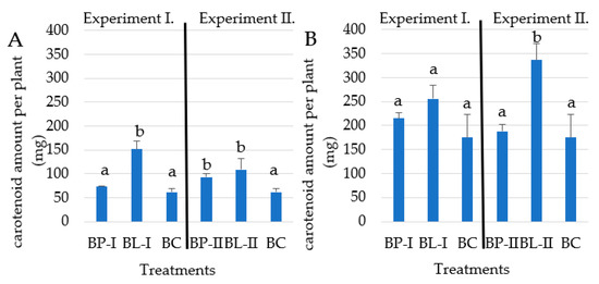 The split fertilizer dosage applied under BL-I and BL-II treatments resulted in the highest total carotenoid yield per plant, significantly higher than BC in three and higher than BP-I and BP-II in two cases (Figure 4). Generally lower carotenoid contents were measured in every treatment, in the first year, compared to the second experimental year.