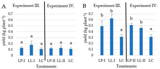It is clearly supported by the results that potassium played an important role in the yield of purple-fleshed sweet potato (Figure 5). The application of K2O predominant fertilizer improved the yield compared to the control plot in both years in the case of the purple-fleshed variety in Experiment III and IV. In the 2021 growing season, the highest value of 0.18 kg plant−1 was measured under the LL-I treatment which was 80% higher than the value of 0.1 kg plant−1 measured in the control plot (Figure 5). The growing season of 2022 was favorable for sweet potato production, so the yields were significantly higher than in the first year. The highest value was measured under the LL-I treatment as well in the 2022 growing season, reaching 0.62 kg plant−1. The LL-I treatment resulted in 100% higher yields compared to LC with 0.31 kg plant−1 yield.