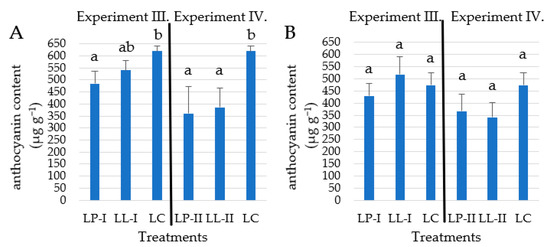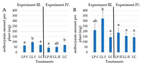Anthocyanin formation is significantly influenced by environmental factors such as abiotic stress. The growing season of 2021 was unfavorable for batata cultivation, also confirmed by the lower yields. In Experiment III, under the LL-I treatment, the anthocyanin content was 540.3 µg g−1, which was not clearly distinguished statistically from the concentration in the control 620.2 µg g−1, despite the 13% difference (Figure 6). Other studies reported around 13 100–13 420 µg g−1 (calculated for dry weight) total anthocyanin content from different purple-fleshed sweet potato cultivars [46,47]. Peng et al. [48] reported 793–3 650 µg g−1 (calculated for dry weight) total anthocyanin content from commercially available, purple-fleshed sweet potatoes. A very high level of total anthocyanin content (30 446 µg g−1 (calculated for dry weight)) was reported from the Korean cultivar ‘Sinjami’ [49].