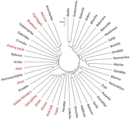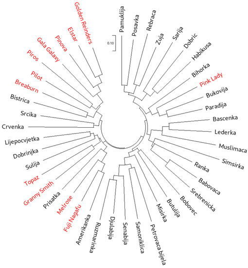 Microsatellite profiles of the SNP genotyped accessions (both the traditional cultivars comprising the core collection and the international reference cultivars) were obtained from previous studies by Gaši et al. [21,22,23]. These studies relied on the use of ten microsatellite markers published by Gianfranceschi et al. [38] (CH01H02, CH01H10, CH01H01, CH02C06) and Liebhard et al. [39] (CH04E02, CH05E04, CH02C02a, CH05E03, CH02D08, CH02C02b).