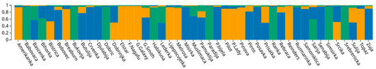 The population structure for SSR dataset was estimated with STRUCTURE v2.3.4 software [55]. Most probable K value estimation was evaluated using Structure harvester ver. 0.6.1 application [56]. The accessions were assigned to the genetic clusters according to their highest membership coefficient, with the assigning probability (ql) of 80% according to similar studies [12,57,58]. All accessions with the probability of membership below 80% were classified as admixed. The online software “Structure Plot v2.0” [59] was used to generate a bar plot of the results from Bayesian genetic structure analyses.