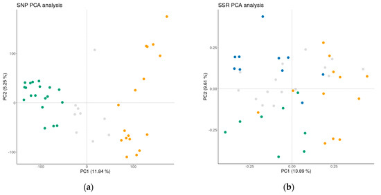 Principal component analysis of the apple germplasm collection based on SNP loci (a) and SSR loci; (b) Yellow—international reference cultivars, Gray—admixed, Green (GC2) and Blue (GC3)—traditional apple cultivars.