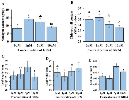 The effect of SLs on the nitrogen and chlorophyll content (SPAD index) and the leaf dimensions (leaf length, width, and area) in the M9 apple rootstocks. (A,B) The leaf nitrogen content per gram and the chlorophyll SPAD index, respectively, according to the different concentrations of GR24. (C–E) The leaf length, width, and area, respectively, according to the different concentrations of GR24. Bars labeled with a different letter are significantly different (p ≤ 0.05) according to Duncan’s test. The bars show standard errors.