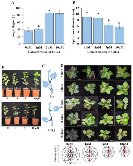 SLs at 5 and 10 µM significantly increased the angle between the stem and leaf. However, there was no significant difference between the 0 µM and 1 µM concentrations. On the contrary, SLs significantly decreased the diameter of the apical area, and there was no significant difference between 0 µM and 1 µM. However, 1 µM showed slightly lower diameter values than 0 µM (Figure 2). The leaf–stem angles of plants treated with 5 and 10 µM ranged from 80° to 90°.