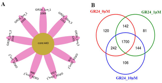 The Venn and petal core diagrams showed differences in the attracted microorganisms (Figure 3). Of note, the rhizosphere of the plants treated with GR24 attracted a higher relative abundance of Fibrobacteres, Planctomycetes, Microgenomates, Gemmatimonadetes, Chloroflexi, FCPU426, WS6, WS2, Chlamydiae, Nitrospirae, TM6_Dependentiae, BRC1, Hydrogenedentes, and Peregrinibacteria Phyla compared to the non-treated plants (0 µM). There are variations in different taxa abundance in the rhizosphere among different groups of samples.