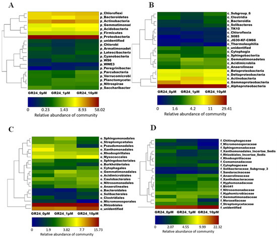 OTUs and their taxonomy level heatmaps and hierarchical clustering analysis between different taxa. Each heat map represents the relative abundance of the community taxa in the different applied GR24 concentrations in the rhizosphere of the M9 apple rootstocks. (A) phylum-level, (B) Class-level, (C) Order-level, and (D) Family-level. The difference in colors represents the relative microbial abundance of the community.