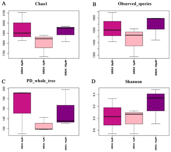Alpha diversity metrics (Chao1 index, observed species, PD_whole_tree, and Shannon index) of OTU-level rhizosphere communities of studied M9 apple rootstocks. The Box diagrams of alpha diversity metrics show the relationship among the three groups. The box chart contains 4 main data node indexes. The data are arranged sequentially, and the upper edge, upper quartile, median, lower quartile, and lower edge are calculated. The abscissa is the group name, and the ordinate is the Alpha index. (A,B) Box plots for comparison of species richness (Chao1 index; observed species) between the two study groups. (C) Boxplots for comparison of phylogenetic diversity (PD_whole_tree). (D) Boxplots for comparison of species diversity (Shannon index).