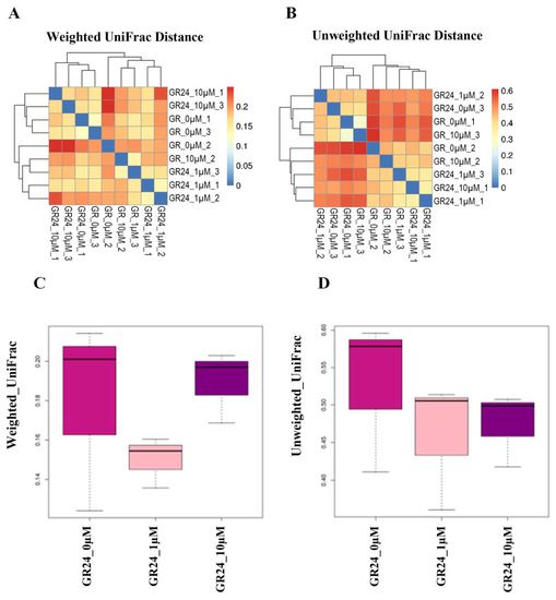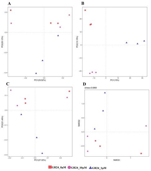 Distance metric indices were used to measure the β diversity between the bacterial communities with the influence of 0, 1, and 10 µM of GR24 and to use the OTU phylogenetic level to analyze the diversity in the different communities (OTUs defined at a 97% similarity cut-off). To compare the bacterial composition of identified microbial community members of the rhizosphere UniFrac and Bray–Curtis dissimilarity, matrices were calculated on normalized. Similarities and dissimilarities in microbial community structures among samples were displayed using principal component analysis (PCA), principal coordinates analysis (PCoA), partial least squares discrimination analysis (PLs-DA), and the non-metric multidimensional scaling method (NMDs). The analysis was constructed using UniFrac weighted and unweighted distance metric indices to analyze the quantitative and qualitative diversity between samples. It was demonstrated that there was a difference between samples in the community based on the UniFrac distances between the rhizosphere samples and qualitative variation (presence and absence of organism) between the control and the treatments of 0 and10 µM. Treatment of 1 µM revealed apparent quantitative variation with 0 µM compared to the variation between 0 and 10 µM (Figure 6). When using PCA, PLS-DA, and PCoA analysis at the OTU level, PC1 revealed 23.52%, 15%, and 27%, respectively, of the total variation; PC2 revealed 20.12%, 13.19%, and 49%, respectively. The beta diversity metric analysis showed a distinction between the microbial communities of 0, 1, and 10 µM treatment concentrations. However, there was relative similarity in the rhizosphere bacterial community between 0 and 10 µM (Figure 7).