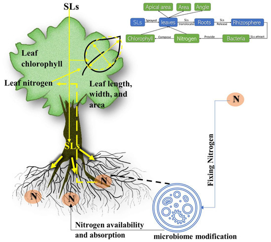 The SLs were sprayed on the leaves, which may have had multiple effects. First, SLs might play a role in changing the leaf shape and its position by altering the leaf and stem attachment angles and the apical leaves’ diameters. Second, SLs may be transported to the roots to attract rhizosphere microorganisms and enhance nitrogen absorption. Finally, the nitrogen might be translocated to the leaves, affecting the chlorophyll content and, thus, the leaf characteristics (Figure 8).