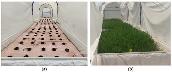 A total of 6 floating systems were used in the experiment. Each system was composed of ponds (113 cm × 300 cm × 25 cm) covered with polyethylene foil. Styrofoam with a thickness of 20 mm was placed on the solution to float the plants. Based on the daily measurements via an oxygen meter, oxygen was provided to the plant roots with an air motor. In the study, the average amount of dissolved oxygen applied to the solution was 6.4 mg L−1.