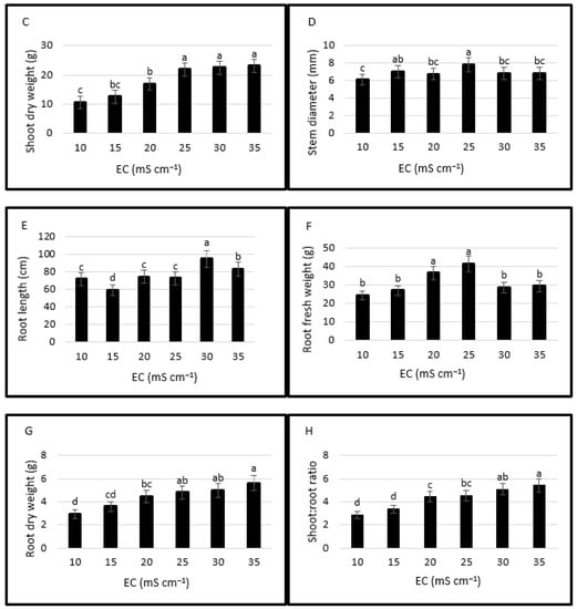 Shoot: root ratio gradually increased with increasing salinity [31] and the highest ratio (5.41) was at 35 mS cm−1. Shoot: root ratio at 10, 15, 20, 25 and 30 mS cm−1 was lower at 46.95, 37.34, 17.93, 15.53, and 5.73%, respectively (Figure 3H).