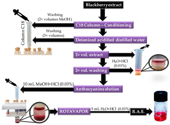 As schematically illustrated in Figure 1, the solid phase extraction (SPE) of blackberries anthocyanins was carried out. The blackberry extract was passed through SPE C18 column (200 mg/3 mL) (Finisterre by Teknokroma, Barcelona, Spain)The remaining compounds in the sorbent were washed with water acidified with 0.01% HCl, and then the anthocyanins were eluted with 10 mL of acidified methanol (0.01% HCl). The rotavapor was used to evaporate the methanol from the anthocyanin extract. The aqueous extract obtained was dissolved with 0.01% HCl acidified water to give the anthocyanin-rich extract (R.A.E.) [31].