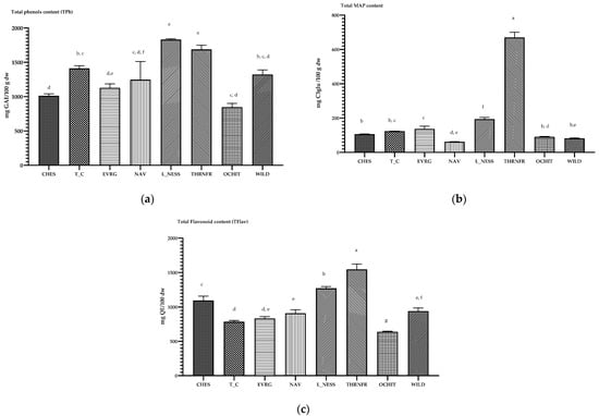 The bioactive compounds of blackberry varieties. (a) Total phenols content (TPh) expressed as milligram gallic acid equivalent (GAE)/100 g dry weight (dw); (b) total monomeric anthocyanin content (MAP) expressed as cyanidin-3-glucoside (mg C3glu/100 g dw.); and (c) total flavonoid content (TFlav) expressed as milligrams of quercetin equivalent (QE)/100 g dw. All results represent the mean ± SD of triplicate analysis. Different letters indicate a significant difference (p < 0.05) between varieties.
