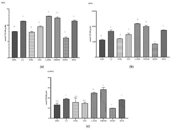 The antioxidant capacity of eight blackberry varieties determined by three different methods; (a) FRAP (ferric reducing ability of plasma) expressed in mmol Trolox Equivalents (TE)/100 g dw; (b) DPPH (2,2, diphenyl-picryl-hydrazyl) expressed in mmol TE/100 g dw; and (c) CUPRAC (Cupric Ion Reducing Antioxidant Capacity) expressed in mmol TE/100 g dw. All results represent the mean ± SD of triplicate analysis. Different letters indicate a significant difference (p < 0.05) for each variety.