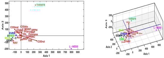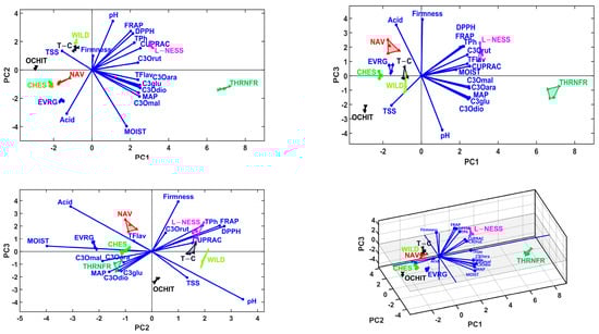 Geometrical variable vector arrangement can prescribe the multivariate correlations between the variables and, furthermore, the variable grouping. Biplots from Figure 4 suggest five singleton groups: Firmness, Moisture, Acidity, TSS pH, and C3Orut, and two multiple variable groups. The first multiple variables group consists of FRAP, DPPH, TPh, and CUPRAC; the second group consists of TFlav, MAP, C3glu, C3Oara, C3Omal, and C3Odio. These variable groups determine the samples’ spatial distributions. Cultivar samples THRNFR and L_NESS have high levels of antioxidant capacity (FRAP, DPPH, TPh, and CUPRAC) together with TFlav, TPh, MAP, C3glu, C3Oara, C3Omal, and C3Odio, also for Moisture, pH, and medium level for Firmness. Cultivars OCHIT, WILD, and T_C perform high levels of TSS and pH, but with the lowest levels of the other variables. Cultivar samples EVRG, CHES, and NAV perform high levels for variables Acidity, Firmness, and Moisture, but with the lowest levels of the other variables (see Figure 4). In order to determine that this kind of samples grouping (i.e., based on PCA results) generates the same clusters, the LDA, MANOVA (p = 0.05) and HCA statistical multivariate methods were applied to the principal coordinates of the samples (i.e., the PC of the samples consisted as input data for mentioned methods).