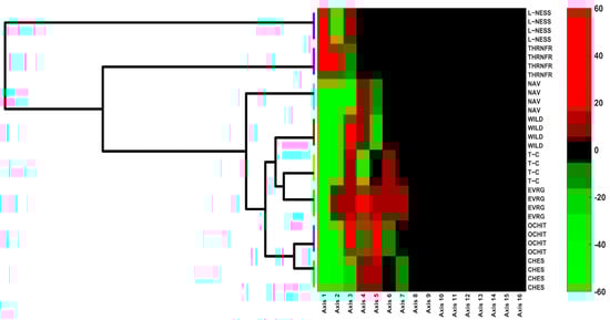 The heatmap emphasizes that by choosing only the first three canonical axes (e.g., the first three principal axes), the clustering conclusions are still valid (Figure 6, from Axis 4, the black color means null contributions to the clustering process).