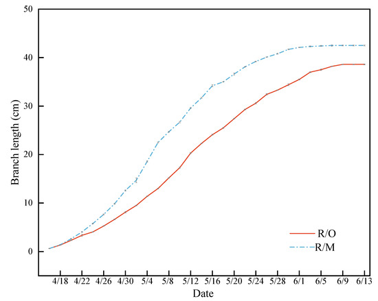 The effects of the Cerasus humilis rootstocks on peach tree vigor are shown in Table 3 and Figure 1. As shown in Table 3, compared with the control group, the height and secondary branch number of the one-year-old trees decreased by 1.14% and 3.79%, respectively. All other indicators increased, and the tertiary branch number and tertiary branch thickness increased the most, by 122.22% and 26.86%, respectively. Compared to R/M, there was no growth in tertiary branches for R/O after two years, and the primary branch number and secondary branch thickness increased by 32.33% and 10.69%, respectively. All other indicators decreased, and tree height and secondary branch number decreased the most, by 16.35% and 34.94%, respectively. The number, length, and thickness of the branches decreased to varying degrees, which was consistent with the growth rate and volume of new shoots (Figure 1). The recorded phenology is presented in Table A1.
