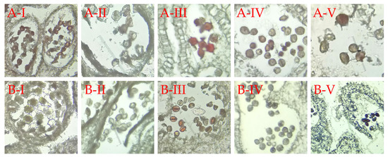 During the sampling period, most spores in the peach combinations were in the tetrad stage. As the flower buds grew and developed, the developmental progress of spores in the grafted peach combinations varied. The developmental progress of R/O compared to R/M was one period ahead. R/O entered the early uninucleate stage on 9 March and the binucleate stage on 24 March, whereas R/M only entered the early uninucleate stage on 14 March and the marginal uninucleate stage on 24 March (Table 5 and Figure 2).