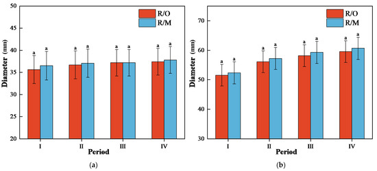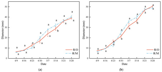 Comparison of longitudinal and transverse diameters of fruit during the fruit growth period for grafted peach combinations. (a) Longitudinal diameter. (b) Transverse diameter. Note: R/O: Ruipan 4/Cerasus humilis; RM: Ruipan 4/Amygdalus persica L.; Means are separated by Duncan’s multiple range test; different letters following the data stand for significant differences at p = 0.05.