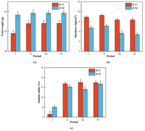 Comparison of single-fruit weight (a), hardness (b), and soluble solids (c) of fruits at different maturity stages. Note: R/O: Ruipan 4/Cerasus humilis; RM: Ruipan 4/Amygdalus persica L.; Means are separated by Duncan’s multiple range test; different letters following the data stand for significant differences at p = 0.05; I period is 29 May, II period is 1 June, III period is 4 June, IV period is 7 June.