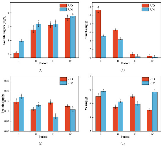 Comparison of soluble sugars (a), starch (b), protein (c), and vitamin C (d) in fruits of different maturity levels. Note: R/O: Ruipan 4/Cerasus humilis; RM: Ruipan 4/Amygdalus persica L.; Means are separated by Duncan’s multiple range test; different letters following the data stand for significant differences at p = 0.05; I period is 29 May, II period is 1 June, III period is 4 June, IV period is 7 June.