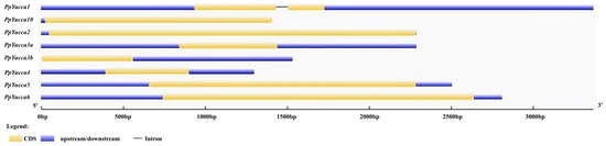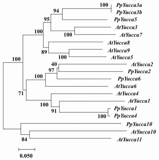 Cluster analysis of eight Yucca genes and eleven Yucca genes in Arabidopsis thaliana (Figure 7) showed that these genes can be divided into two main groups: AtYucca10, AtYucca11, and PpYucca10 belong to one group, whereas the other genes belong to the other group. Analysis of the exon and intron structures of the eight PpYucca genes using the online GSDS tool (Figure 8) revealed that PpYucca1, PpYucca3, PpYucca4, PpYucca5, and PpYucca6 have two exons, whereas PpYucca10, PpYucca2, and PpYucca3b have one exon. PpYucca1 contained only one intron.