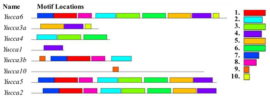 Ten conserved motifs in the R/O Yucca protein were predicted using the MEME website, and the amino acid sequences of these motifs are shown in Table 8. Figure 9 shows the distribution of these ten conserved motifs in the eight Yucca genes.