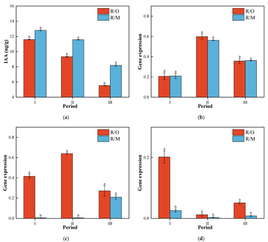 Comparison of IAA production and differential gene expression of Yucca in the grafted peach combination. (a) IAA production. (b) Expression of PpYucca6 gene. (c) Expression of PpYucca5 gene. (d) Expression of PpYucca2 gene. Note: R/O: Ruipan 4/Cerasus humilis; RM: Ruipan 4/Amygdalus persica L.; Means are separated by Duncan’s multiple range test; different letters following the data stand for significant differences at p = 0.05; I period is 29 May, II period is 1 June, III period is 4 June, IV period is 7 June.