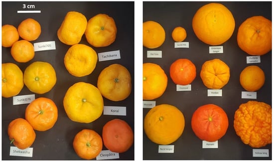 - Oueslati, A.; Salhi-Hannachi, A.; Luro, F.; Vignes, H.; Mournet, P.; Ollitrault, P. Genotyping by sequencing reveals the interspecific C. maxima/C. reticulata admixture along the genomes of modern citrus varieties of mandarins, tangors, tangelos, orangelos and grapefruits. PLoS ONE 2017, 12, e0185618. [Google Scholar] [CrossRef]