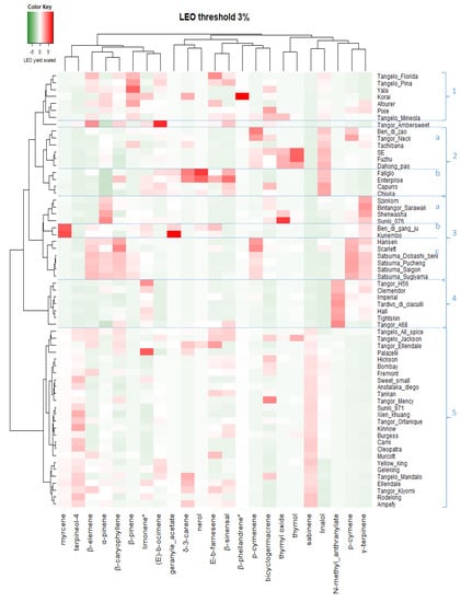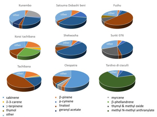 - Lota, M.-L.; de Rocca Serra, D.; Tomi, F.; Casanova, J. Chemical variability of peel and leaf essential oils of 15 species of mandarins. Biochem. Syst. Ecol. 2001, 29, 77–104. [Google Scholar] [CrossRef] [PubMed]