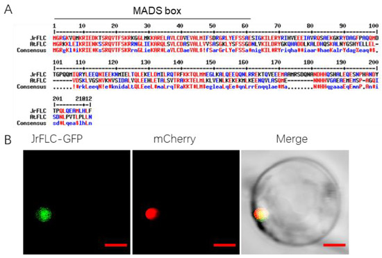 (A) Sequence alignment of Juglans regia and Arabidopsis thaliana FLC proteins. The N-terminal regions of JrFLC and AtFLC showed a conserved MINICHROMOSOME MAINTENANCE 1 (MCM1), AGAMOUS (AG), DEFICIENS (DEF), and SERUM RESPONSE FACTOR (SRF) (MADS)-box domain. Sequence identity between JrFLC and AtFLC was 45.5%. (B) Subcellular localization of JrFLC. JrFLC tagged with green fluorescent protein (GFP) co-localized with a nuclear marker. Bars in (B) were 50 μm.